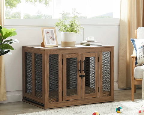 Made of durable wood and metal mesh, this indoor dog kennel ensures excellent ventilation, with a reinforced 0.59-inch thick bottom panel and a 200lb weight capacity on top for added stability.