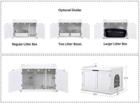 Fits most standard litter boxes, and extra storage space for litter, scoops, and pet accessories.